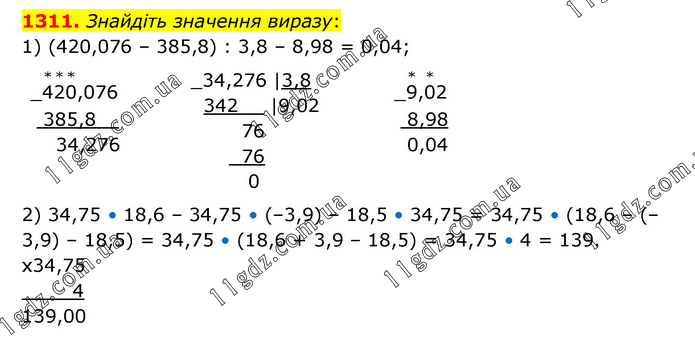 1311. Знайдіть значення виразу: 1) (420,076 – 385,8) : 3,8 – 8,98 = 0,04; 2) 34,75 • 18,6 – 34,75 • (–3,9) – 18,5 • 34,75 = 34,75 • (18,6 – (–3,9) – 18,5) = 34,75 • (18,6 + 3,9 – 18,5) = 34,75 • 4 = 139.