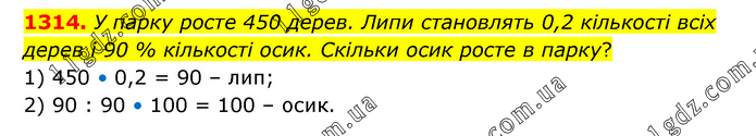 1314. У парку росте 450 дерев. Липи становлять 0,2 кількості всіх дерев і 90 % кількості осик. Скільки осик росте в парку? 1) 450 • 0,2 = 90 – лип; 2) 90 : 90 • 100 = 100 – осик.