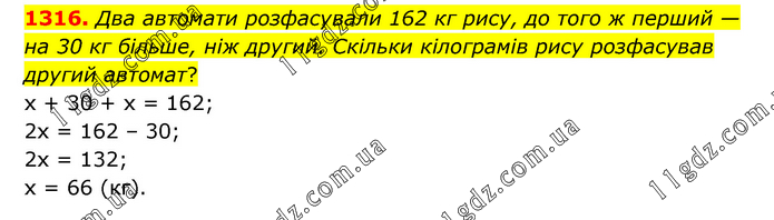 Два автомати розфасували 162 кг рису, до того ж перший — на 30 кг більше, ніж другий. Скільки кілограмів рису розфасував другий автомат? х + 30 + х = 162; 2х = 162 – 30; 2х = 132; х = 66 (кг).
