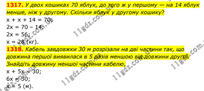 1317. У двох кошиках 70 яблук, до того ж у першому — на 14 яблук менше, ніж у другому. Скільки яблук у другому кошику? х + х + 14 = 70; 2х = 70 – 14; 2х = 56; х = 28 (кг). 1318. Кабель завдовжки 30 м розрізали на дві частини так, що довжина першої виявилася в 5 разів меншою від довжини другої. Знайдіть довжину меншої частини кабелю. х + 5х = 30; 6х = 30; х = 5 (м).
