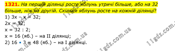 На першій ділянці росте яблунь утричі більше, або на 32 більше, ніж на другій. Скільки яблунь росте на кожній ділянці? 1) 3х – х = 32; 2х = 32; х = 32 : 2; х = 16 (яб.) – на ІІ ділянці; 2) 16 • 3 = 48 (яб.) – на І ділянці.