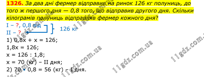 За два дні фермер відправив на ринок 126 кг полуниць, до того ж першого дня — 0,8 того, що відправив другого дня. Скільки кілограмів полуниць відправляв фермер кожного дня? 1) 0,8х + х = 126; 1,8х = 126; х = 126 : 1,8; х = 70 (кг) – ІІ дня; 2) 70 • 0,8 = 56 (кг) – І дня.
