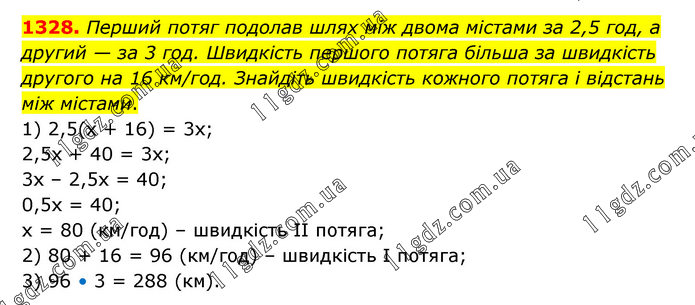 Перший потяг подолав шлях між двома містами за 2,5 год, а другий — за 3 год. Швидкість першого потяга більша за швидкість другого на 16 км/год. Знайдіть швидкість кожного потяга і відстань між містами. 1) 2,5(х + 16) = 3х; 2,5х + 40 = 3х; 3х – 2,5х = 40; 0,5х = 40; х = 80 (км/год) – швидкість ІІ потяга; 2) 80 + 16 = 96 (км/год) – швидкість І потяга; 3) 96 • 3 = 288 (км).