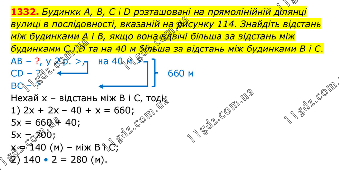 Будинки А, В, C і D розташовані на прямолінійній ділянці вулиці в послідовності, вказаній на рисунку 114. Знайдіть відстань між будинками А і В, якщо вона вдвічі більша за відстань між будинками C і D та на 40 м більша за відстань між будинками В і С. Нехай х – відстань між В і С, тоді: 1) 2х + 2х – 40 + х = 660; 5х = 660 + 40; 5х = 700; х = 140 (м) – між В і С; 2) 140 • 2 = 280 (м).