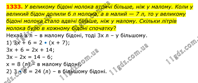У великому бідоні молока втричі більше, ніж у малому. Коли у великий бідон долили 6 л молока, а в малий — 7 л, то у великому бідоні молока стало вдвічі більше, ніж у малому. Скільки літрів молока було в кожному бідоні спочатку? Нехай х л – в малому бідоні, тоді 3х л – у більшому. 1) 3х + 6 = 2 • (х + 7); 3х + 6 = 2х + 14; 3х – 2х = 14 – 6; х = 8 (л) – в малому бідоні; 2) 3 • 8 = 24 (л) – в більшому бідоні.