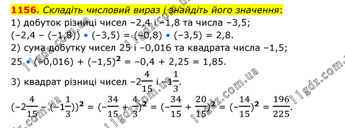 Складіть числовий вираз і знайдіть його значення: 1) добуток різниці чисел –2,4 і –1,8 та числа –3,5; (–2,4 – (–1,8)) • (–3,5) = (–0,8) • (–3,5) = 2,8. 2) сума добутку чисел 25 і –0,016 та квадрата числа –1,5; 25 • (–0,016) + (–1,5)2 = –0,4 + 2,25 = 1,85. 3) квадрат різниці чисел –24/15 і –11/3. (–24/15 – (–11/3))2 = (–34/15 + 4/3)2 = (–34/15 + 20/15)2 = (–14/15)2 = 196/225.