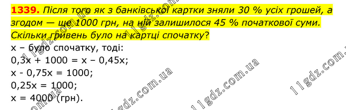 Після того як з банківської картки зняли 30 % усіх грошей, а згодом — ще 1000 грн, на ній залишилося 45 % початкової суми. Скільки гривень було на картці спочатку? х – було спочатку, тоді: 0,3х + 1000 = х – 0,45х; х - 0,75х = 1000; 0,25х = 1000; х = 4000 (грн).