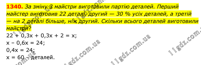 За зміну 3 майстри виготовили партію деталей. Перший майстер виготовив 22 деталі, другий — 30 % усіх деталей, а третій — на 2 деталі більше, ніж другий. Скільки всього деталей виготовили майстри? 22 + 0,3х + 0,3х + 2 = х; х – 0,6х = 24; 0,4х = 24; х = 60 – деталей.