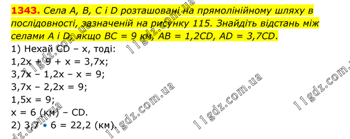 Села А, В, C і D розташовані на прямолінійному шляху в послідовності, зазначеній на рисунку 115. Знайдіть відстань між селами A i D, якщо BC = 9 км, AB = 1,2CD, AD = 3,7CD. 1) Нехай CD – х, тоді: 1,2х + 9 + х = 3,7х; 3,7х – 1,2х – х = 9; 3,7х – 2,2х = 9; 1,5х = 9; х = 6 (км) – CD. 2) 3,7 • 6 = 22,2 (км).