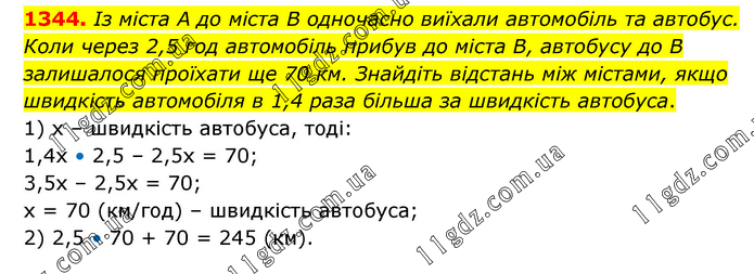 Із міста А до міста В одночасно виїхали автомобіль та автобус. Коли через 2,5 год автомобіль прибув до міста В, автобусу до В залишалося проїхати ще 70 км. Знайдіть відстань між містами, якщо швидкість автомобіля в 1,4 раза більша за швидкість автобуса. 1) х – швидкість автобуса, тоді: 1,4х • 2,5 – 2,5х = 70; 3,5х – 2,5х = 70; х = 70 (км/год) – швидкість автобуса; 2) 2,5 • 70 + 70 = 245 (км).