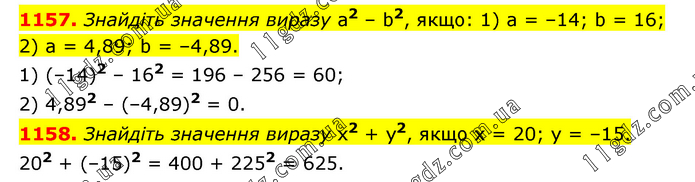 1157. Знайдіть значення виразу а2 – b2, якщо: 1) а = –14; b = 16; 2) а = 4,89; b = –4,89. 1) (–14)2 – 162 = 196 – 256 = 60; 2) 4,892 – (–4,89)2 = 0. 1158. Знайдіть значення виразу х2 + у2, якщо х = 20; у = –15. 202 + (–15)2 = 400 + 2252 = 625.