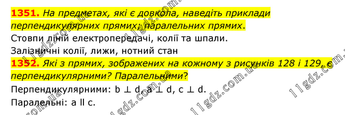 1351. На предметах, які є довкола, наведіть приклади перпендикулярних прямих; паралельних прямих. Стовпи ліній електропередачі, колії та шпали. Залізничні колії, лижи, нотний стан 1352. Які з прямих, зображених на кожному з рисунків 128 і 129, є перпендикулярними? Паралельними? Перпендикулярними: b ⟂ d, a ⟂ d, с ⟂ d. Паралельні: а ll c.