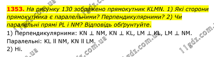 На рисунку 130 зображено прямокутник KLMN. 1) Які сторони прямокутника є паралельними? Перпендикулярними? 2) Чи паралельні прямі PL і NM? Відповідь обґрунтуйте. 1) Перпендикулярними: KN ⟂ NM, KN ⟂ KL, LM ⟂ KL, LM ⟂ NM. Паралельні: KL ll NM, KN ll LM. 2) Ні.