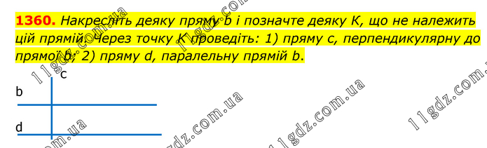 Накресліть деяку пряму b і позначте деяку К, що не належить цій прямій. Через точку K проведіть: 1) пряму с, перпендикулярну до прямої b; 2) пряму d, паралельну прямій b.