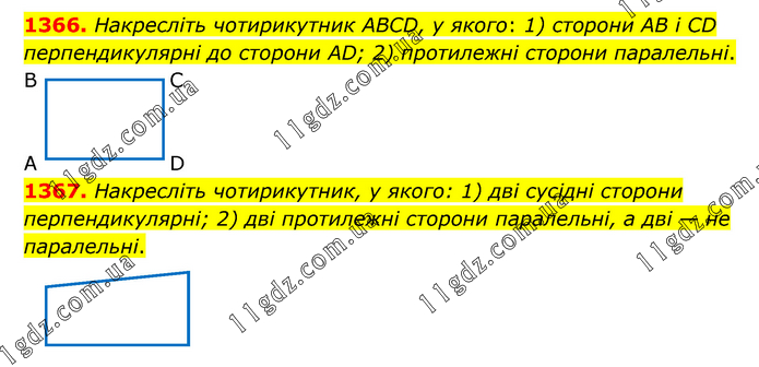 Накресліть чотирикутник ABCD, у якого: 1) сторони AB і CD перпендикулярні до сторони AD; 2) протилежні сторони паралельні. 1367. Накресліть чотирикутник, у якого: 1) дві сусідні сторони перпендикулярні; 2) дві протилежні сторони паралельні, а дві — не паралельні.