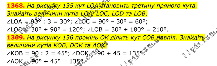 1368. На рисунку 135 кут LOA становить третину прямого кута. Знайдіть величини кутів LOA, LOC, LOD та LOB. ∠LOA = 90° : 3 = 30°; ∠LOC = 90° – 30° = 60°; ∠LOD = 30° + 90° = 120°; ∠LOB = 30° + 180° = 210°. 1369. На рисунку 136 промінь OK ділить кут СОВ навпіл. Знайдіть величини кутів KOB, DOK та AOK. ∠KOB = 90 : 2 = 45°; ∠DOK = 90 + 45 = 135°; ∠AOK = 90° + 45° = 135°.
