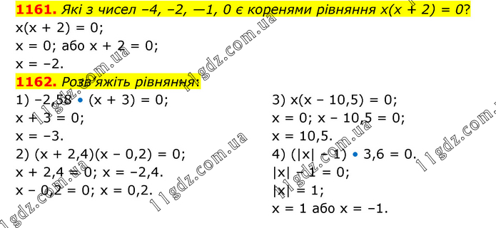 1161. Які з чисел –4, –2, —1, 0 є коренями рівняння х(х + 2) = 0? х(х + 2) = 0; х = 0; або х + 2 = 0; х = –2. 1162. Розв’яжіть рівняння: 1) –2,58 • (х + 3) = 0; х + 3 = 0; х = –3. 2) (х + 2,4)(х – 0,2) = 0; х + 2,4 = 0; х = –2,4. х – 0,2 = 0; х = 0,2. 3) х(х – 10,5) = 0; х = 0; х – 10,5 = 0; х = 10,5. 4) (|х| – 1) • 3,6 = 0. |х| – 1 = 0; |х| = 1; х = 1 або х = –1.