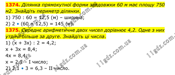 1374. Ділянка прямокутної форми завдовжки 60 м має площу 750 м2. Знайдіть периметр ділянки. 1) 750 : 60 = 12,5 (м) – ширина; 2) 2 • (60 + 12,5) = 145 (м). 1375. Середнє арифметичне двох чисел дорівнює 4,2. Одне з них утричі більше за друге. Знайдіть ці числа. 1) (х + 3х) : 2 = 4,2; х + 3х = 8,4; 4х = 8,4; х = 2,1 – І число; 2) 2,1 • 3 = 6,3 – ІІ число.