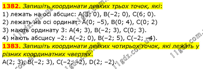 1382. Запишіть координати деяких трьох точок, які: 1) лежать на осі абсцис: А(3; 0), В(–2; 0), С(6; 0). 2) лежать на осі ординат: А(0; –5), В(0; 4), С(0; 2) 3) мають ординату 3: А(4; 3), В(–2; 3), С(0; 3). 4) мають абсцису –2: А(–2; 0), В(–2; 5), С(–2; –4). 1383. Запишіть координати деяких чотирьох точок, які лежать у різних координатних чвертях. А(2; 3), В(–2; 3), С(–2; –2), D(2; –2).