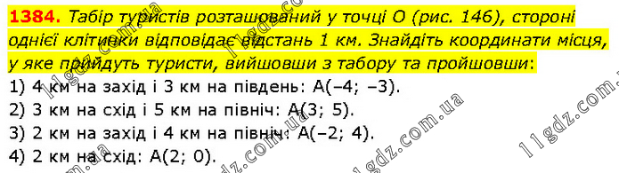 1384. Табір туристів розташований у точці O (рис. 146), стороні однієї клітинки відповідає відстань 1 км. Знайдіть координати місця, у яке прийдуть туристи, вийшовши з табору та пройшовши: 1) 4 км на захід і 3 км на південь: А(–4; –3). 2) 3 км на схід і 5 км на північ: А(3; 5). 3) 2 км на захід і 4 км на північ: А(–2; 4). 4) 2 км на схід: А(2; 0).