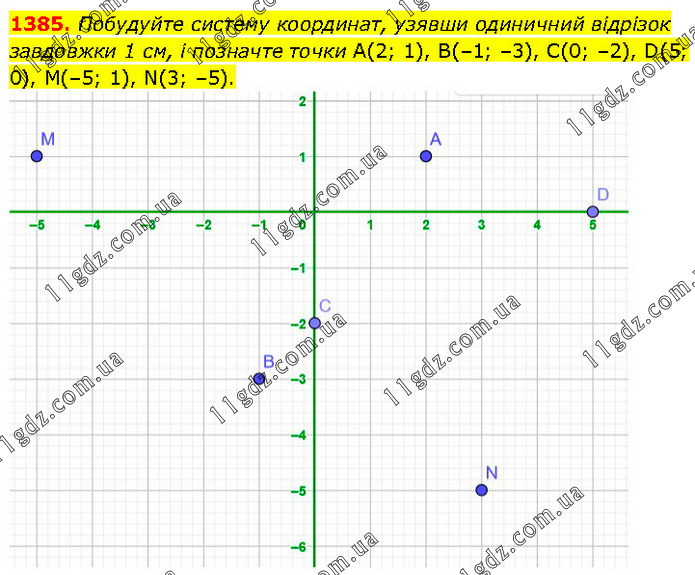 Побудуйте систему координат, узявши одиничний відрізок завдовжки 1 см, і позначте точки А(2; 1), В(–1; –3), С(0; –2), D(5; 0), М(–5; 1), N(3; –5).