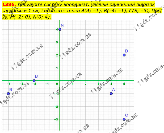Побудуйте систему координат, узявши одиничний відрізок завдовжки 1 см, і позначте точки А(4; –1), В(–4; –1), С(5; –3), D(5; 2), М(–2; 0), N(0; 4).