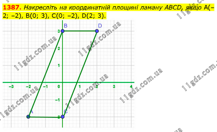 Накресліть на координатній площині ламану ABCD, якщо А(–2; –2), В(0; 3), С(0; –2), D(2; 3).