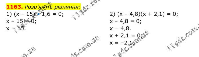 Розв’яжіть рівняння: 1) (х – 15) • 1,6 = 0; х – 15 = 0; х = 15. 2) (х – 4,8)(х + 2,1) = 0; х – 4,8 = 0; х = 4,8. х + 2,1 = 0; х = –2,1.
