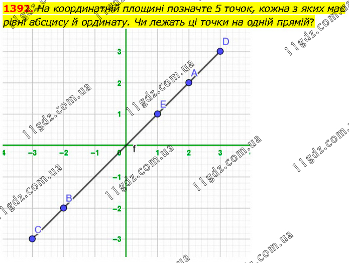 На координатній площині позначте 5 точок, кожна з яких має рівні абсцису й ординату. Чи лежать ці точки на одній прямій?