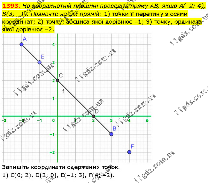 На координатній площині проведіть пряму AB, якщо А(–2; 4), В(3; –1). Позначте на цій прямій: 1) точки її перетину з осями координат; 2) точку, абсциса якої дорівнює –1; 3) точку, ордината якої дорівнює –2. Запишіть координати одержаних точок. 1) С(0; 2), D(2; 0), E(–1; 3), F(4; –2).