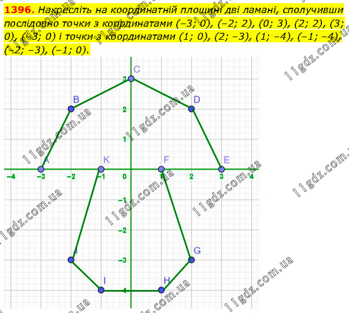 Накресліть на координатній площині дві ламані, сполучивши послідовно точки з координатами (–3; 0), (–2; 2), (0; 3), (2; 2), (3; 0), (–3; 0) і точки з координатами (1; 0), (2; –3), (1; –4), (–1; –4), (–2; –3), (–1; 0).