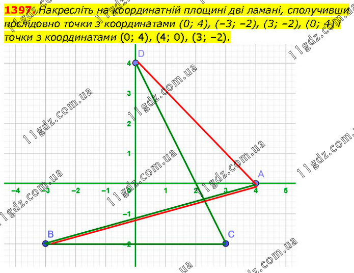 Накресліть на координатній площині дві ламані, сполучивши послідовно точки з координатами (0; 4), (–3; –2), (3; –2), (0; 4) і точки з координатами (0; 4), (4; 0), (3; –2).