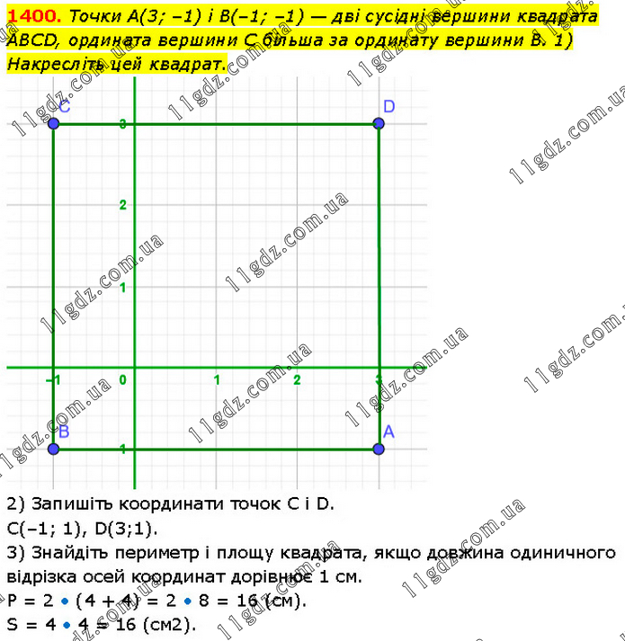 Точки А(3; –1) і В(–1; –1) — дві сусідні вершини квадрата ABCD, ордината вершини C більша за ординату вершини В. 1) Накресліть цей квадрат. 2) Запишіть координати точок C i D. C(–1; 1), D(3;1). 3) Знайдіть периметр і площу квадрата, якщо довжина одиничного відрізка осей координат дорівнює 1 см. Р = 2 • (4 + 4) = 2 • 8 = 16 (см). S = 4 • 4 = 16 (см2).