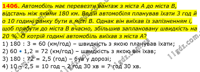 Автомобіль має перевезти вантаж з міста А до міста В, відстань між якими 180 км. Водій автомобіля планував їхати 3 год й о 10 годині ранку бути в місті В. Однак він виїхав із запізненням і, щоб прибути до міста В вчасно, збільшив заплановану швидкість на 20 %. O котрій годині автомобіль виїхав з міста А? 1) 180 : 3 = 60 (км/год) – швидкість з якою планував їхати; 2) 60 • 1,2 = 72 (км/год) – швидкість з якою він їхав; 3) 180 : 72 = 2,5 (год) – був у дорозі; 4) 10 – 2,5 = 10 год – 2 год 30 хв = 7 год 30 хв.