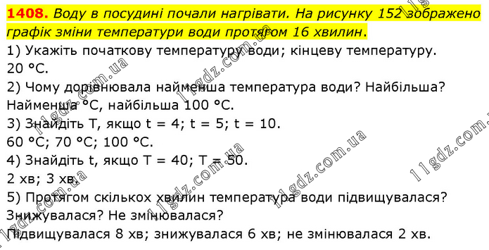 Воду в посудині почали нагрівати. На рисунку 152 зображено графік зміни температури води протягом 16 хвилин. 1) Укажіть початкову температуру води; кінцеву температуру. 20 °C. 2) Чому дорівнювала найменша температура води? Найбільша? Найменша °C, найбільша 100 °C. 3) Знайдіть Т, якщо t = 4; t = 5; t = 10. 60 °C; 70 °C; 100 °C. 4) Знайдіть t, якщо T = 40; T = 50. 2 хв; 3 хв. 5) Протягом скількох хвилин температура води підвищувалася? Знижувалася? He змінювалася? Підвищувалася 8 хв; знижувалася 6 хв; не змінювалася 2 хв.