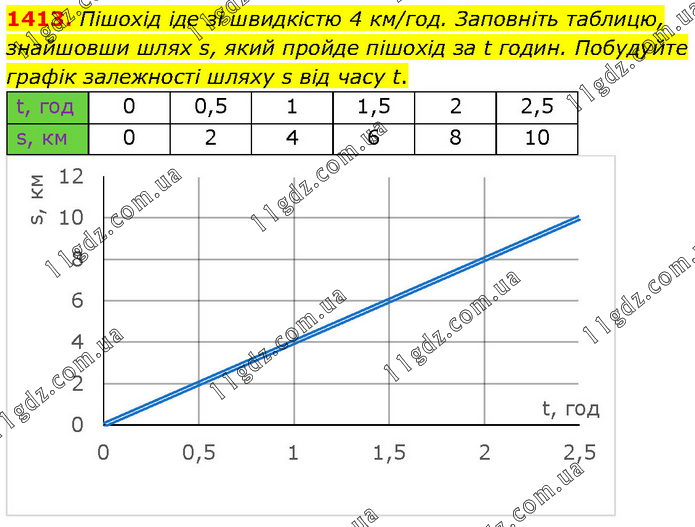 Пішохід іде зі швидкістю 4 км/год. Заповніть таблицю, знайшовши шлях s, який пройде пішохід за t годин. Побудуйте графік залежності шляху s від часу t.