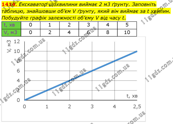 Екскаватор щохвилини виймає 2 м3 ґрунту. Заповніть таблицю, знайшовши об’єм V ґрунту, який він виймає за t хвилин. Побудуйте графік залежності об’єму V від часу t.