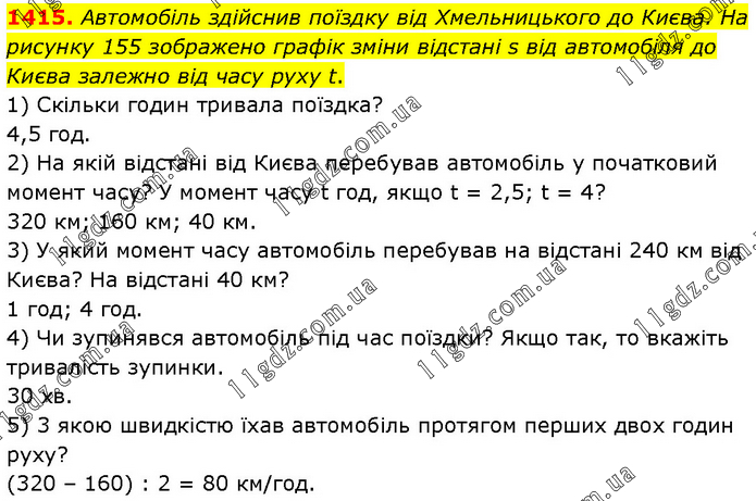 Автомобіль здійснив поїздку від Хмельницького до Києва. На рисунку 155 зображено графік зміни відстані s від автомобіля до Києва залежно від часу руху t. 1) Скільки годин тривала поїздка? 4,5 год. 2) На якій відстані від Києва перебував автомобіль у початковий момент часу? У момент часу t год, якщо t = 2,5; t = 4? 320 км; 160 км; 40 км. 3) У який момент часу автомобіль перебував на відстані 240 км від Києва? На відстані 40 км? 1 год; 4 год. 4) Чи зупинявся автомобіль під час поїздки? Якщо так, то вкажіть тривалість зупинки. 30 хв. 5) 3 якою швидкістю їхав автомобіль протягом перших двох годин руху? (320 – 160) : 2 = 80 км/год.
