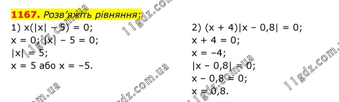 Розв’яжіть рівняння: 1) х(|х| – 5) = 0; x = 0; |x| – 5 = 0; |x| = 5; х = 5 або х = –5. 2) (х + 4)|х – 0,8| = 0; х + 4 = 0; х = –4; |x – 0,8| = 0; x – 0,8 = 0; х = 0,8.