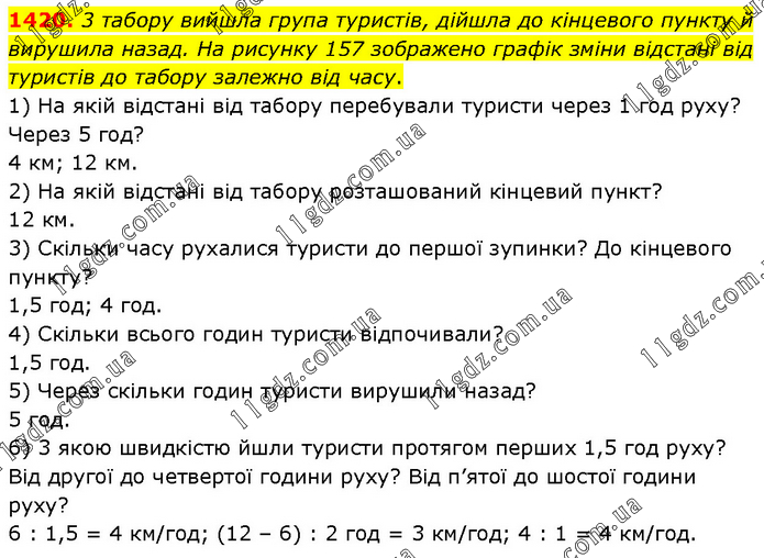 3 табору вийшла група туристів, дійшла до кінцевого пункту й вирушила назад. На рисунку 157 зображено графік зміни відстані від туристів до табору залежно від часу. 1) На якій відстані від табору перебували туристи через 1 год руху? Через 5 год? 4 км; 12 км. 2) На якій відстані від табору розташований кінцевий пункт? 12 км. 3) Скільки часу рухалися туристи до першої зупинки? До кінцевого пункту? 1,5 год; 4 год. 4) Скільки всього годин туристи відпочивали? 1,5 год. 5) Через скільки годин туристи вирушили назад? 5 год. 6) 3 якою швидкістю йшли туристи протягом перших 1,5 год руху? Від другої до четвертої години руху? Від п’ятої до шостої години руху? 6 : 1,5 = 4 км/год; (12 – 6) : 2 год = 3 км/год; 4 : 1 = 4 км/год.