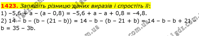 Запишіть різницю даних виразів і спростіть її: 1) –5,6 + а – (а – 0,8) = –5,6 + а – а + 0,8 = –4,8. 2) 14 – b – (b – (21 – b)) = 14 – b – (b – 21 + b) = 14 – b – b + 21 – b = 35 – 3b.