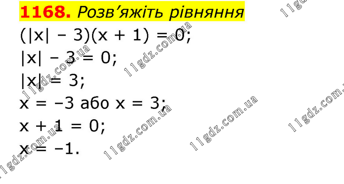 Розв’яжіть рівняння (|х| – 3)(х + 1) = 0; |x| – 3 = 0; |x| = 3; х = –3 або х = 3; х + 1 = 0; х = –1.