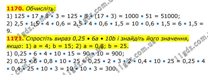 1170. Обчисліть: 1) 125 • 17 • 8 • 3 = 125 • 8 • (17 • 3) = 1000 • 51 = 51000; 2) 2,5 • 1,5 • 4 • 0,6 = 2,5 • 4 • 0,6 • 1,5 = 10 • 0,6 • 1,5 = 6 • 1,5 = 9. 1171. Спростіть вираз 0,25 • 6a • 10b і знайдіть його значення, якщо: 1) а = 4; b = 15; 2) а = 0,8; b = 25. 1) 0,25 • 6 • 4 • 10 • 15 = 90 • 10 = 900; 2) 0,25 • 6 • 0,8 • 10 • 25 = 0,25 • 2 • 3 • 2 • 0,4 • 10 • 25 = 0,25 • 4 • 0,4 • 25 • 10 • 3 = 10 • 10 • 3 = 300.