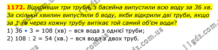 Відкривши три труби, з басейна випустили всю воду за 36 хв. За скільки хвилин випустили б воду, якби відкрили дві труби, якщо за 1 хв через кожну трубу витікає той самий об’єм води? 1) 36 • 3 = 108 (хв) – вся вода з однієї труби; 2) 108 : 2 = 54 (хв.) – вся вода з двох труб.