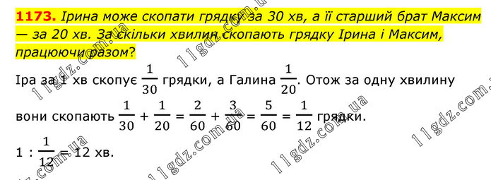 Ірина може скопати грядку за 30 хв, а її старший брат Максим — за 20 хв. За скільки хвилин скопають грядку Ірина і Максим, працюючи разом? Іра за 1 хв скопує 1/30 грядки, а Галина 1/20. Отож за одну хвилину вони скопають 1/30 + 1/20 = 2/60 + 3/60 = 5/60 = 1/12 грядки. 1 : 1/12 = 12 хв.
