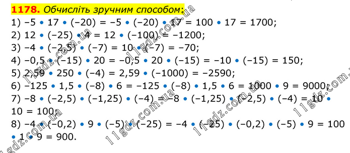 Обчисліть зручним способом: 1) –5 • 17 • (–20) = –5 • (–20) • 17 = 100 • 17 = 1700; 2) 12 • (–25) • 4 = 12 • (–100) = –1200; 3) –4 • (–2,5) • (–7) = 10 • (–7) = –70; 4) –0,5 • (–15) • 20 = –0,5 • 20 • (–15) = –10 • (–15) = 150; 5) 2,59 • 250 • (–4) = 2,59 • (–1000) = –2590; 6) –125 • 1,5 • (–8) • 6 = –125 • (–8) • 1,5 • 6 = 1000 • 9 = 9000; 7) –8 • (–2,5) • (–1,25) • (–4) = –8 • (–1,25) • (–2,5) • (–4) = 10 • 10 = 100; 8) –4 • (–0,2) • 9 • (–5) • (–25) = –4 • (–25) • (–0,2) • (–5) • 9 = 100 • 1 • 9 = 900.