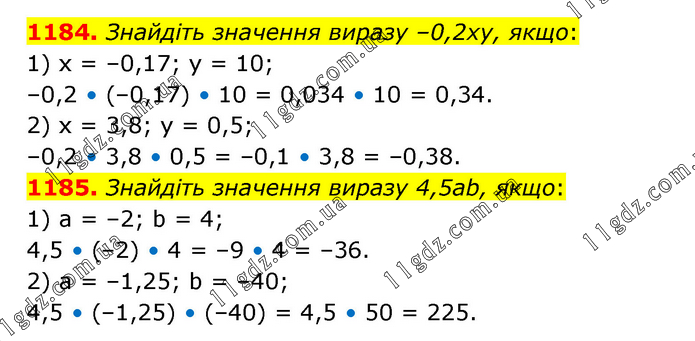 1184. Знайдіть значення виразу –0,2ху, якщо: 1) х = –0,17; у = 10; –0,2 • (–0,17) • 10 = 0,034 • 10 = 0,34. 2) х = 3,8; у = 0,5; –0,2 • 3,8 • 0,5 = –0,1 • 3,8 = –0,38. 1185. Знайдіть значення виразу 4,5аb, якщо: 1) а = –2; b = 4; 4,5 • (–2) • 4 = –9 • 4 = –36. 2) а = –1,25; b = –40; 4,5 • (–1,25) • (–40) = 4,5 • 50 = 225.