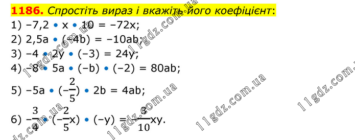 Спростіть вираз і вкажіть його коефіцієнт: 1) –7,2 • х • 10 = –72x; 2) 2,5а • (–4b) = –10ab; 3) –4 • 2у • (–3) = 24y; 4) –8 • 5а • (–b) • (–2) = 80ab; 5) –5a • (–2/5) • 2b = 4ab; 6) –3/4 • (–2/5x) • (–y) = –3/10xy.
