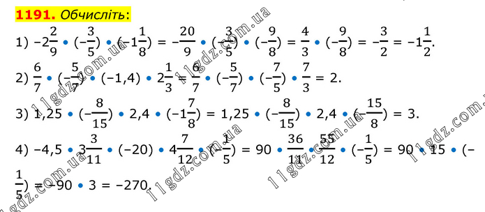 Обчисліть: 1) –22/9 • (–3/5) • (–11/8) = –20/9 • (–3/5) • (–9/8) = 4/3 • (–9/8) = –3/2 = –11/2. 2) 6/7 • (–5/7) • (–1,4) • 21/3 = 6/7 • (–5/7) • (–7/5) • 7/3 = 2. 3) 1,25 • (–8/15) • 2,4 • (–17/8) = 1,25 • (–8/15) • 2,4 • (–15/8) = 3. 4) –4,5 • 33/11 • (–20) • 47/12 • (–1/5) = 90 • 36/11 • 55/12 • (–1/5) = 90 • 15 • (–1/5) = –90 • 3 = –270.