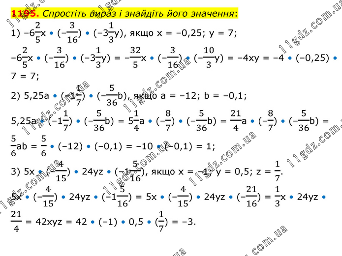 Спростіть вираз і знайдіть його значення: 1) –62/5х • (–3/16) • (–31/3у), якщо х = –0,25; у = 7; –62/5х • (–3/16) • (–31/3у) = –32/5х • (–3/16) • (–10/3у) = –4ху = –4 • (–0,25) • 7 = 7; 2) 5,25а • (–11/7) • (–5/36b), якщо а = –12; b = –0,1; 5,25а • (–11/7) • (–5/36b) = 51/4а • (–8/7) • (–5/36b) = 21/4а • (–8/7) • (–5/36b) = 5/6ab = 5/6 • (–12) • (–0,1) = –10 • (–0,1) = 1; 3) 5x • (–4/15) • 24yz • (–15/16), якщо х = –1; у = 0,5; z = 1/7. 5x • (–4/15) • 24yz • (–15/16) = 5x • (–4/15) • 24yz • (–21/16) = 1/3x • 24yz • 21/4 = 42xyz = 42 • (–1) • 0,5 • (1/7) = –3.